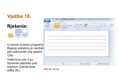 Slika 28. Crtovlje. Vježba 18. Rješenje: U novom prozoru programa Bojanje potrebno je nacrtati pet vodoravnih crta alatom Crta. Veličina je crte 3 px. Spremite datoteku pod imenom Crtovlje.bmp (slika 28.). 17 razred Udžbenik informatike za 5.
