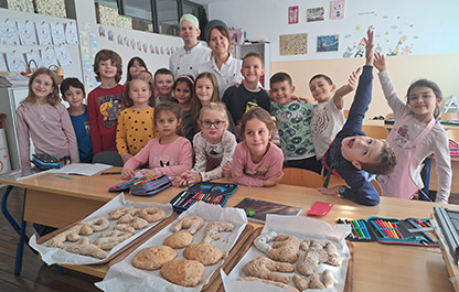 postali su pekari i pekarice. Odlučili su sami napraviti kruščiće od jogurta i brašna. Najprije su vagali i spojili sastojke i zamijesili tijesto, a zatim su ga oblikovali u prva slova njihovih imena i predali u kuhinju..